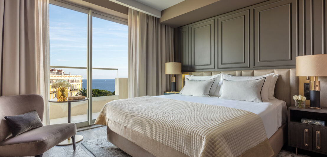 Interieur eines Hotelzimmers mit Blick auf das Mittelmeer
