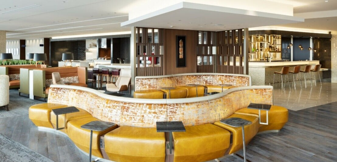 Die Lounge erstreckt sich über zwei Etagen und punktet mit einer Fensterfront zum Vorfeld sowie zahlreichen bequemen Sitzmöglichkeiten. Ein Buffet mit Snacks und eine Bar für Getränkewünsche stehen ebenso zur Verfügung wie Lademöglichkeiten für deine Geräte und Duschmöglichkeiten.