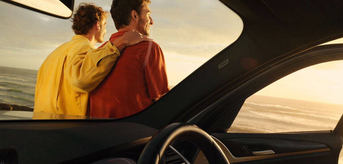 Rückansicht von zwei Männern, die an ein Auto gelehnt sind. Man sieht von dem Auto einen Teil des Innenraums, die Männer blicken auf das Meer hinaus und lächeln.
