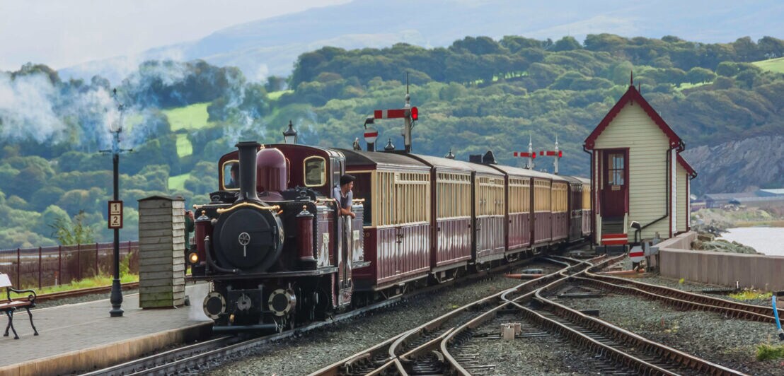 Wer weniger sportlich unterwegs sein möchte, kann mit der historischen Dampflok, der Ffestiniog Railway, durch die malerische Landschaft fahren.