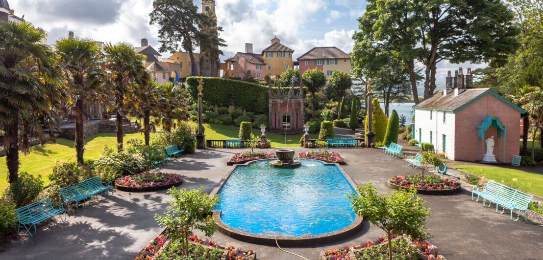 An der Küste von Nordwales, im Snowdonia-Nationalpark, liegt das mediterran anmutende Dorf Portmeirion mit seinen blühenden Ziergärten, Statuen sowie bunten Gebäuden samt Kuppeln und Säulen. Entsprungen ist dieses kleine Stück Italien an der Bucht von Porthmadog der Vision eines einzelnen Mannes: des Architekten Sir Bertram Clough Williams-Ellis.