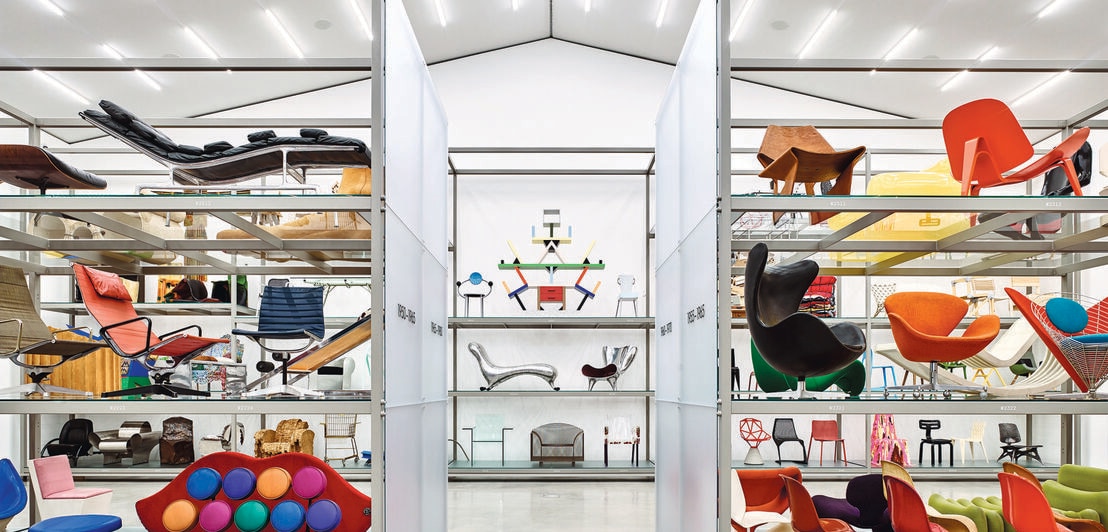 Eine Industriehalle, gefüllt mit Regalreihen, in denen Designmöbel ausgestellt sind