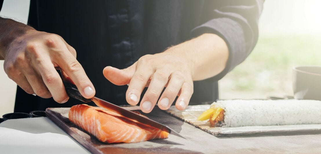 Zwei Hände mit Messer bearbeiten ein Stück Lachs auf einem Brett, daneben eine Reisrolle