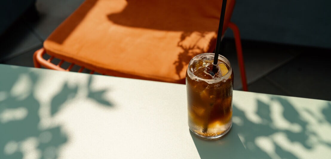 Ein Glas Espresso Tonic mit Strohhalm auf einem Tisch, dahinter steht ein orangefarbener Stuhl.