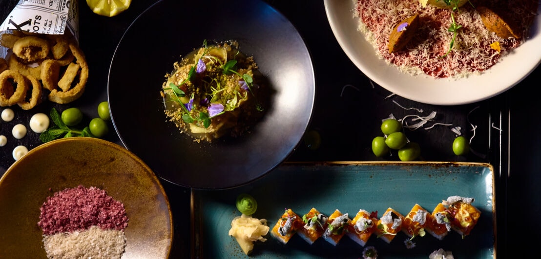 Aufsicht verschiedener, hübsch dekorierter Speisen auf Tellern in unterschiedlichen Formen auf schwarzem Untergrund