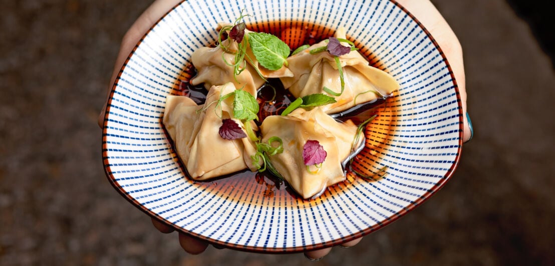 Aufsicht eines Tellers im japanischen Design mit Ravioli in Sojasoße, gehalten von zwei Händen
