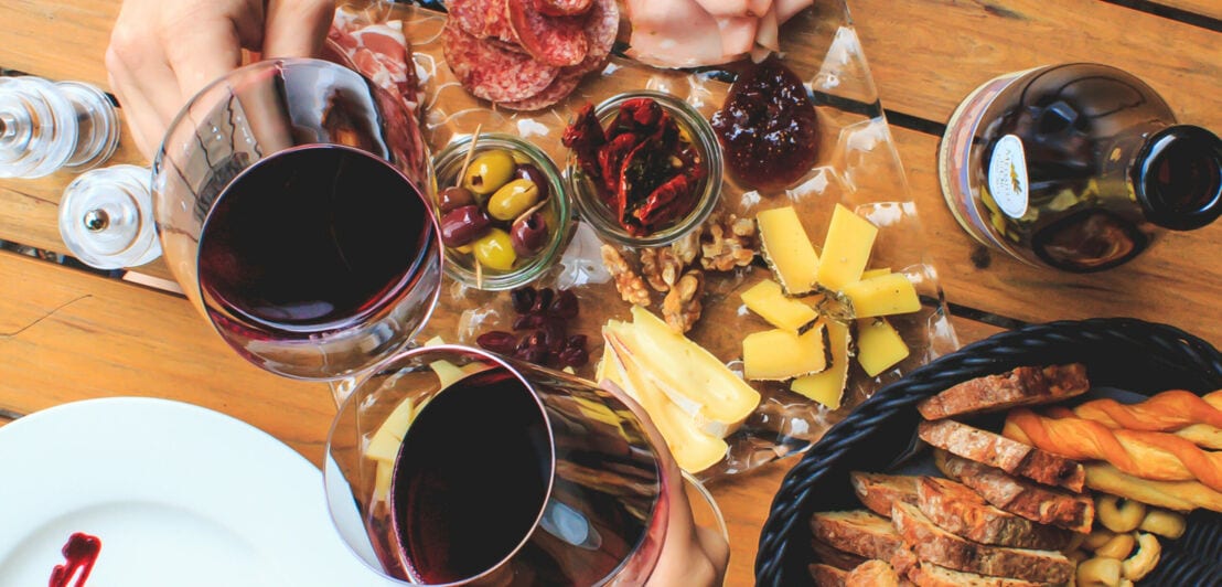 Zwei Personen stoßen mit Rotwein an, auf dem Tisch sind verschiedene Snacks verteilt