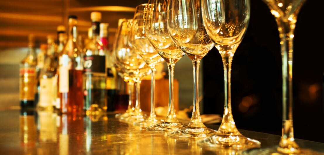 Eine Reihe Weingläser und Flaschen alkoholischer Getränke dahinter