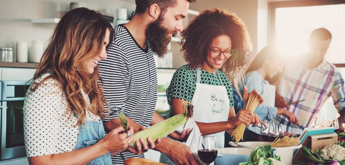 Fünf Personen in einer Küche, die Lebensmittel zubereiten