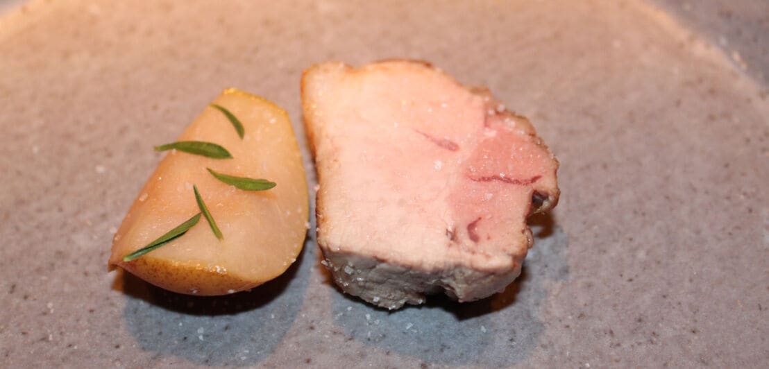 Sehr spartanisch angerichtet geht es mit dem Husumer Landschwein weiter, das sich auf dem Erzeugerhof überwiegend von den Resten der Milch- und Käseproduktion ernährt und daher einen intensiven, fast süßlichen Eigengeschmack mitbringt. Daneben platziert Schäfer lediglich ein kleines Stück Birne, die den Geschmack ideal ergänzt.