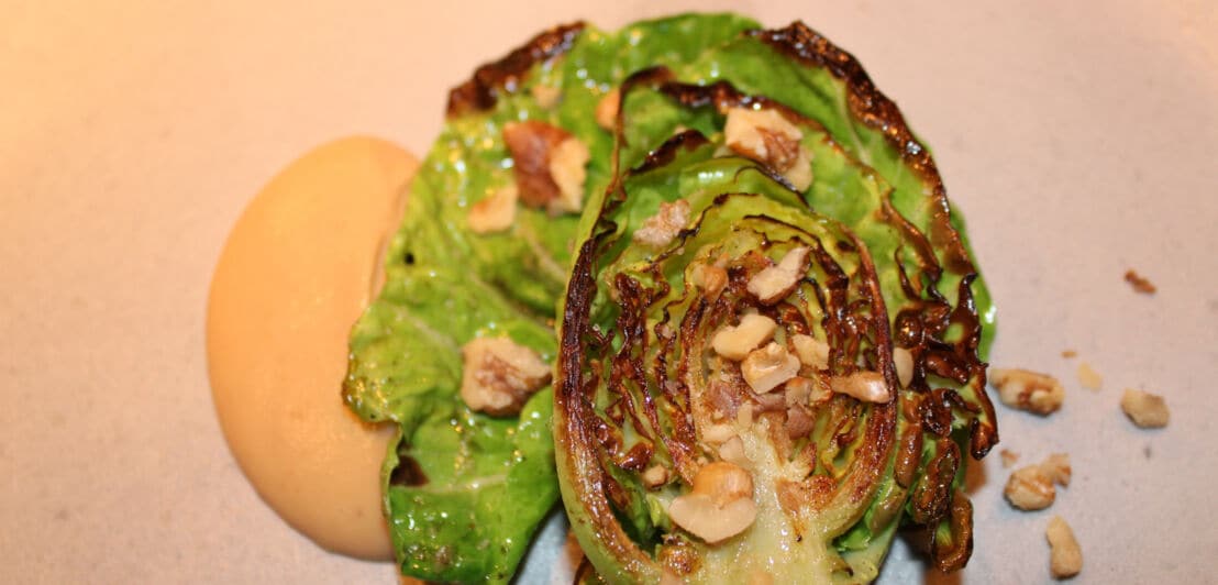 Zum geschmacklichen Höhepunkt gelangen die Gäst:innen bei der Rosenkohlblüte, die mit Walnuss und einer Art Apfelkompott gereicht wird. Die Blüte des Kohls wird normalerweise gar nicht geerntet, dabei schmeckt sie nicht so bitter wie die Knollen, ähnelt von der Struktur her eher einem festen Salat. Ein perfekt abgestimmtes Gericht, bei dem sich die verschiedenen geschmacklichen Nuancen optimal die Waage halten.