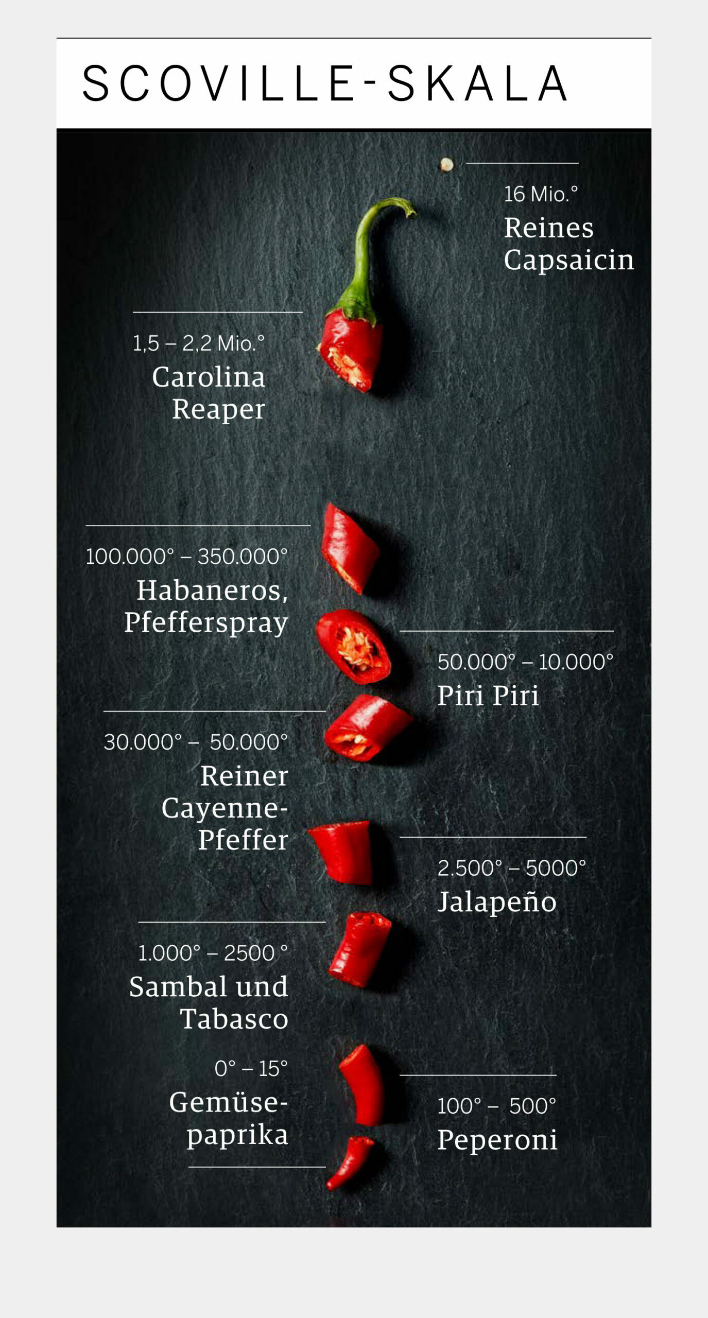 Die Scoville-Skala gibt also Auskunft über Scoville – eine Maßeinheit für Schärfe, die auf dem Grad der Verdünnung basiert, der notwendig ist, um keine Schärfe mehr festzustellen. Wer beim Essen einen deutlichen Schärfereiz verspürt, liegt meist bei einer Scoville-Einheit von 500 oder höher. Aus gesundheitlicher Sicht ist der Verzehr von Scharfmachern wie Chilis und Tabascosoßen unbedenklich – vorausgesetzt, man übertreibt es nicht.