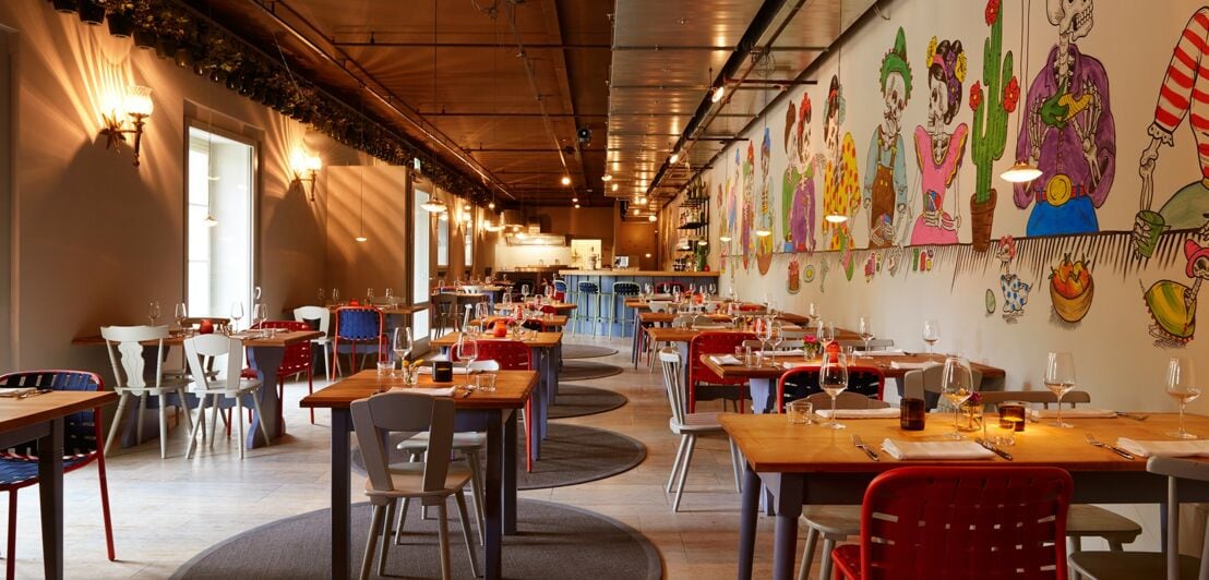Ein Neonschriftzug weist dir den Weg ins vegetarische Restaurant Blitz, das etwas versteckt im ehemaligen Forum des Deutschen Museums auf Münchens Museumsinsel liegt. Unübersehbar gibt es hier mexikanische Küche: Die Wand des langgestreckten Raumes, der entspannt mit bunten Stühlen von Designer Stefan Diez eingerichtet ist, zieren Calaveras-Motive, die typisch bunten und quirligen Skelette des mexikanischen Totentags Día de los Muertos. Sommers lockt die großzügige Terrasse an der Isar mit Lichterketten in den Bäumen und bunten Gartenmöbeln.