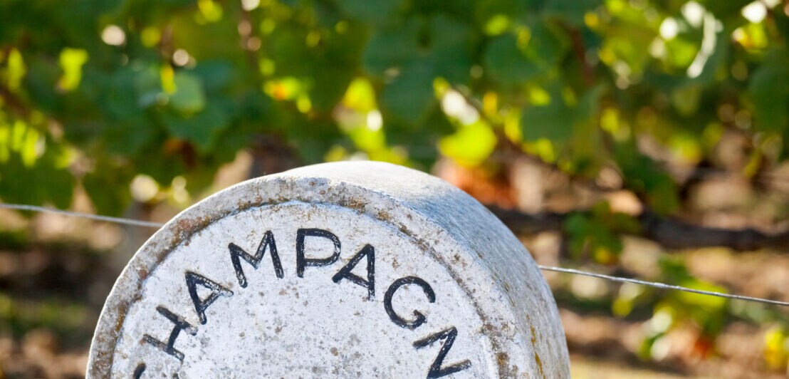 Ein weißer Markierungsstein mit dem Aufschrift Champagne in einem Weinanbaugebiet