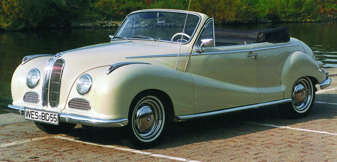 Im April 1951 eröffnete Bundespräsident Theodor Heuss in Frankfurt die erste IAA. Dort präsentierte BMW mit dem Prototyp des 501, dessen geschwungene Form ihm schnell den Spitznamen Barockengel einbrachten. Wirtschaftlich entpuppte sich das Modell jedoch als Flop. Aber: Sein Nachfolger, der BMW 502, trumpfte mit einem völlig neuen, heute legendären Motor auf.