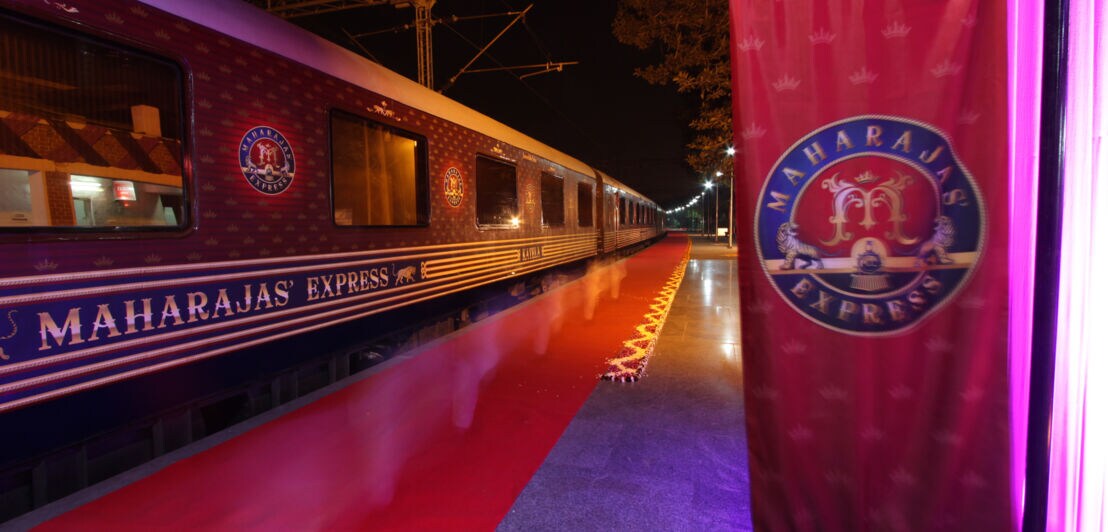 Handgearbeitete Mahagoni-Stühle, edle Mosaiksteine und eine handbemalte Decke: Im Maharajas’ Express trifft der Komfort eines Fünf-Sterne-Hotels auf den Prunk der Maharadscha-Ära. Als besonderes Highlight wird vor jedem Stopp ein roter Teppich für die Reisenden ausgerollt. Mit 80 Kilometern pro Stunde gleitet der rund 1.100 Tonnen schwere Zug entspannt durch die indische Provinz – etwa so schnell wie eine S-Bahn.