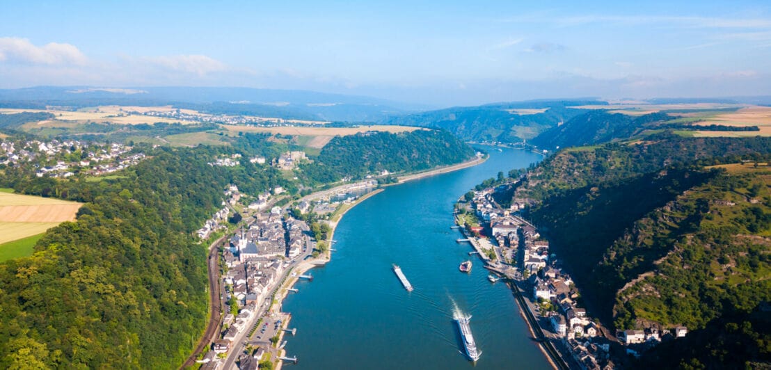 Jetzt näherst du dich einem der berühmtesten Punkte am Rhein: dem Loreleyfelsen bei Sankt Goarshausen. Der Sage nach lockte hier eine schöne Zauberin Männer ins Verderben – und auch für die Schifffahrt galt die enge, felsige Passage lange als anspruchsvoll. Heute ist die Loreley vor allem ein spektakulärer Aussichtspunkt über das Rheintal und ein Muss auf jeder Route der Rheinromantik.