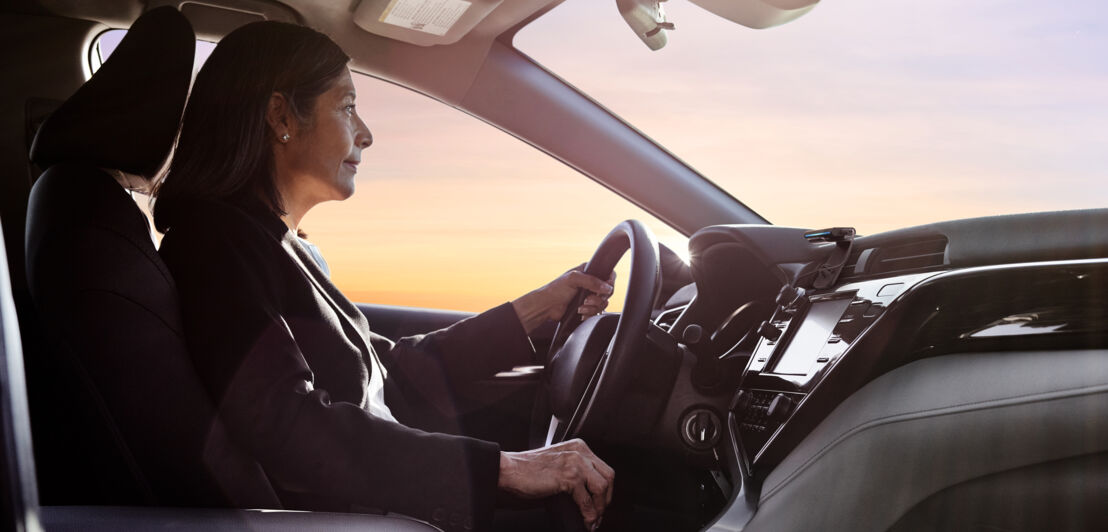 Eine Frau steuert einen PKW, in dem Echo Auto montiert ist.
