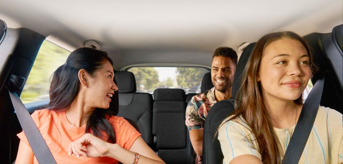 Zwei Frauen und ein Mann sitzen gemeinsam in einem PKW und unterhalten sich.