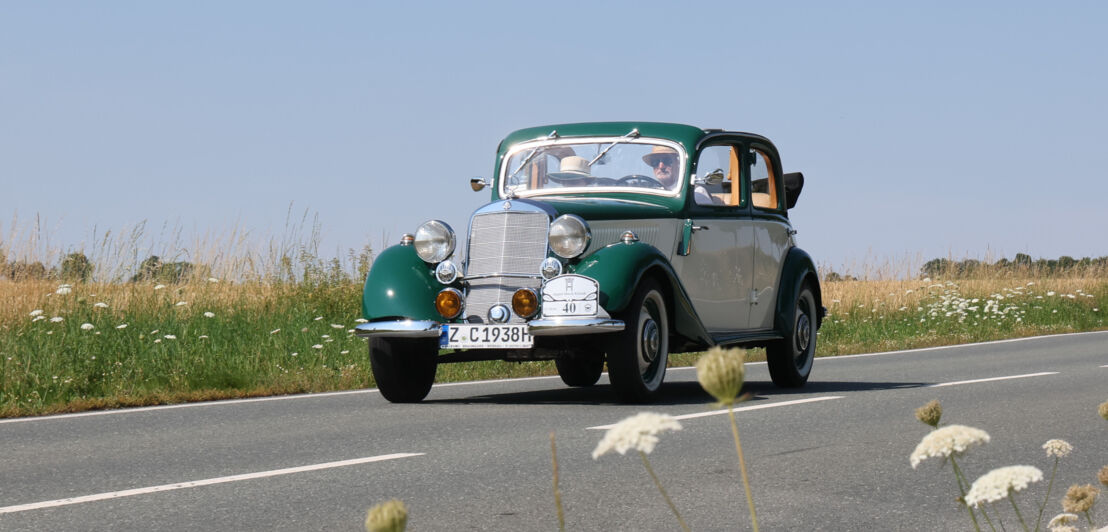Ein grüner Mercedes-Benz Cabriolet Oldtimer mit H-Kennzeichen fährt auf einer Landstraße.