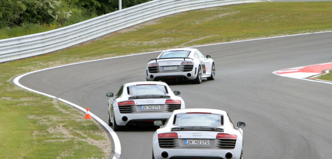 Du kannst mit deinem eigenen Fahrzeug Runden drehen oder dir einen Rennwagen mieten: Ob Coupé, Leichtbau oder Hypercar, es stehen verschiedene Modelle zur Verfügung. Beim Racetrack-Training folgst du in kleinen Gruppen von maximal sieben Fahrzeugen deinem Instruktor über die Strecke.