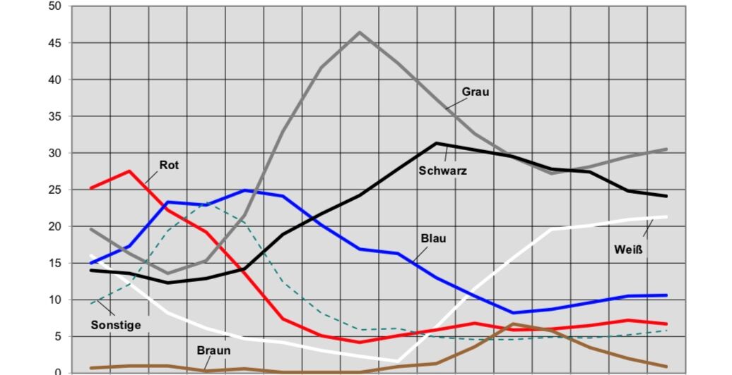Nachts sind alle Katzen grau? Tagsüber sind es die Autos. Den absoluten Höhepunkt erlebte der Mix aus Weiß und Schwarz im Jahr 2004. Damals waren mehr als 46 Prozent aller neu zugelassenen Autos in Deutschland grau – Silbertöne inklusive. Ende 2022 waren es immerhin noch knapp 31 Prozent, berichtet das Kraftfahrt-Bundesamt (KBA) in Flensburg.