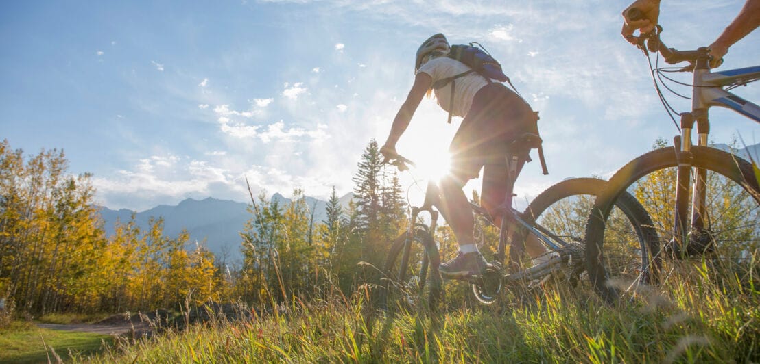 - Nötige Ausrüstung: Im Herbst ist ein Mountainbike mit seinen breiteren Reifen eine bessere Wahl als das dünnbereifte und sturzanfälligere Rennrad, mit dem du im Frühjahr und Sommer durch die Lande saust. Ein Helm ist Pflicht, auf anspruchsvoller Strecke sind auch Knie- und Ellbogenschützer sind ratsam. Im Herbst solltest du wetterfeste Funktionsbekleidung und Schuhe tragen. Achte darauf, dass dein Fahrrad immer voll funktionstüchtig ist.