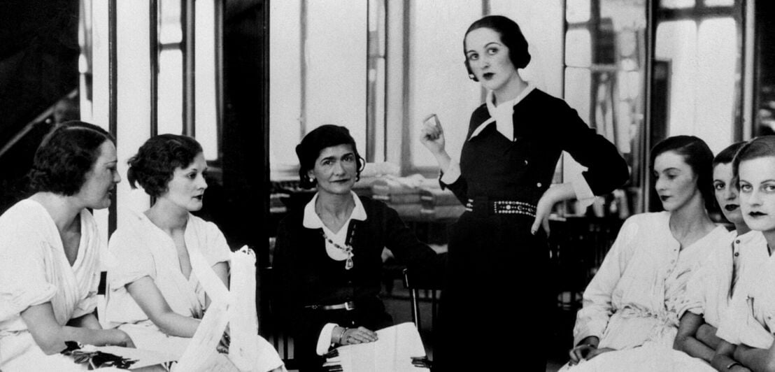 Schwarzweißfoto von Coco Chanel in einem schwarzen Kostüm, umgeben von weiblichen Models in ihrem Modeatelier