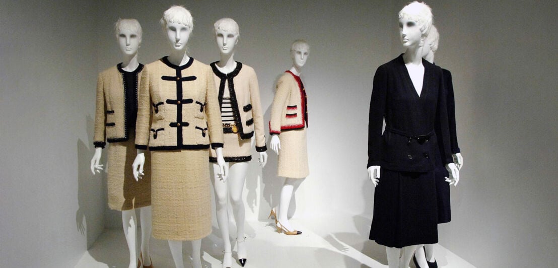 Kostüme und Kleider von Chanel an weißen Schaufensterpuppen in einem Ausstellungsraum
