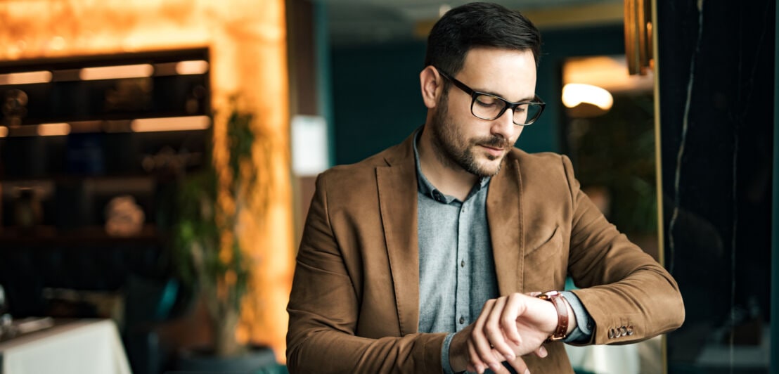 - Für Männer ist ein Anzug mit Hemd und Krawatte in dezenten Farben eine sichere Option. Dabei gibt es einige Details zu beachten: So sollte der Anzug nirgendwo am Körper spannen, aber auch nicht zu locker sitzen. Die Ärmel des Jacketts enden am Daumenansatz, wobei das Hemd für den farblichen Akzent noch etwas hervorragt. Im Stehen ist das Jackett nur mit einem Knopf zu schließen und im Sitzen wird es geöffnet. Und auch Hosenträger wollen richtig getragen werden.