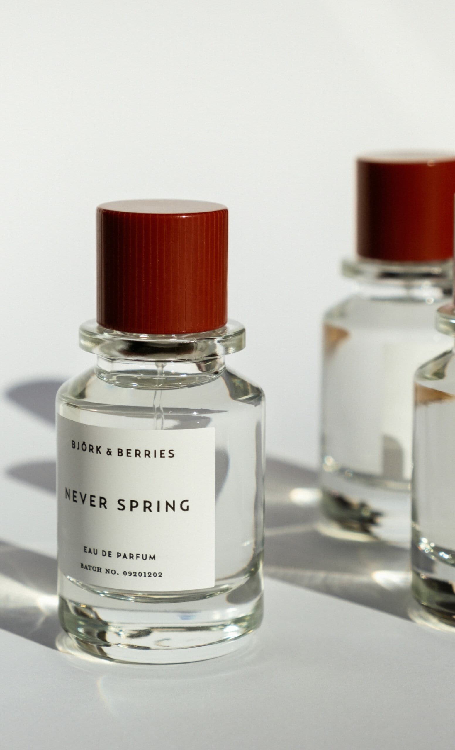 Drei Parfümflakons der Marke björk and berries vor weißem Hintergrund