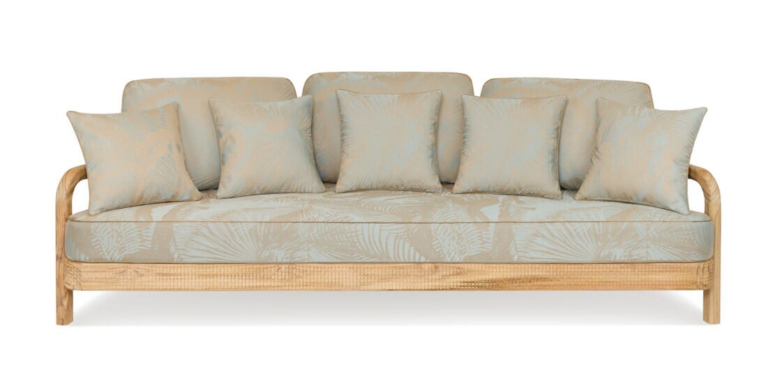 Zum ersten Mal zeigte Armani auch eine Outdoor-Kollektion. Die organisch geschwungenen Sonnenliegen, Sofas und Tische sind aus Teak, Kaktus- und Lotusblumenmotive schmücken viele Polster.