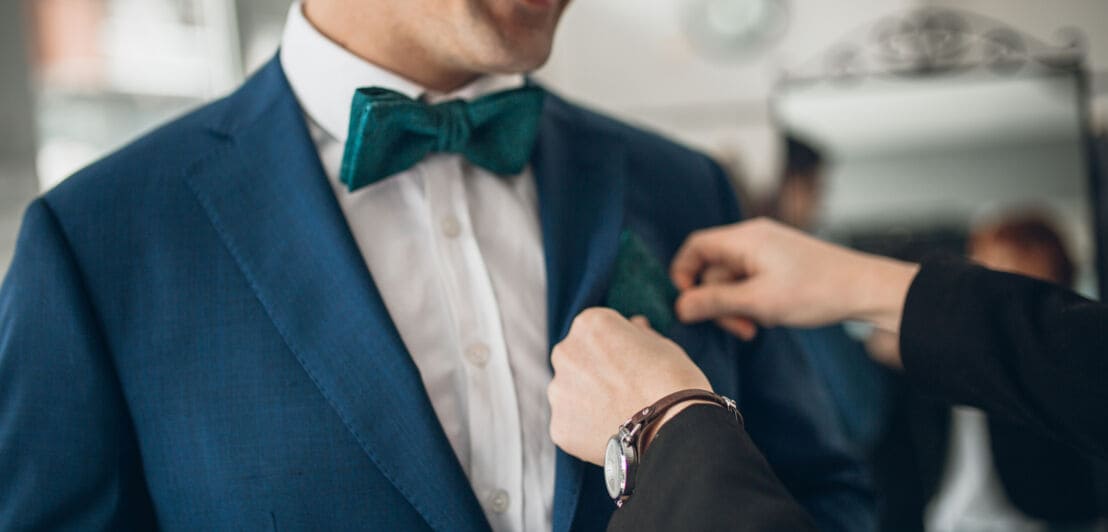 - Vermeide die Farbe Weiß – außer beim Hemd und dem Dresscode White Tie natürlich. Das weiße Einstecktuch und weiße Blumen zum Beispiel im Revers sind dem Bräutigam vorbehalten.