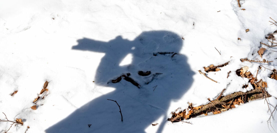 Der Schatten eines Fotografen ist im Schnee zu sehen