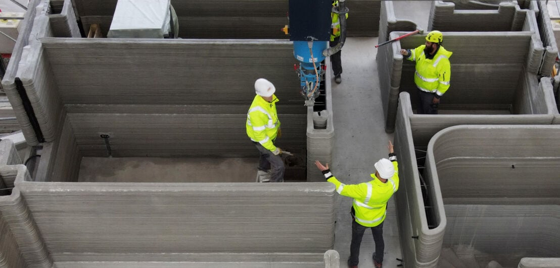 Baustelle mit Bauarbeitern inmitten den Mauern eines Hauses, das mit einem 3D-Drucker erstellt wird