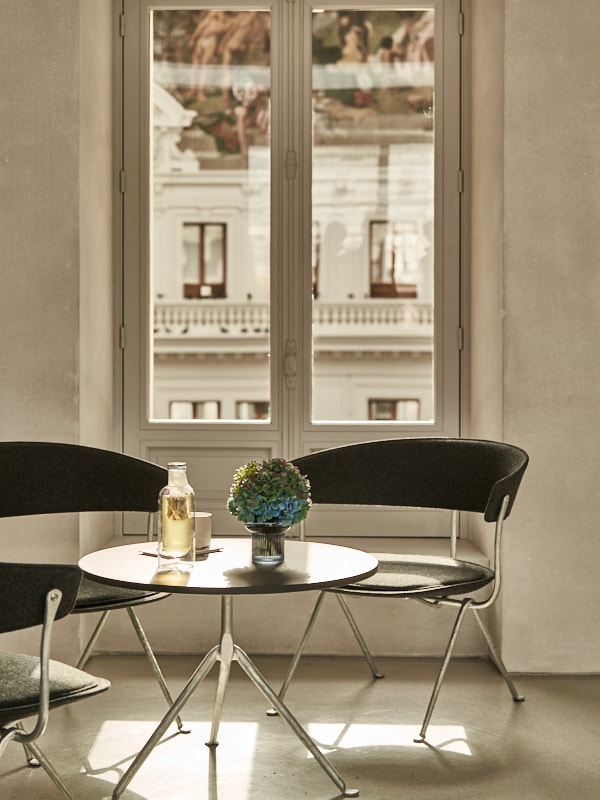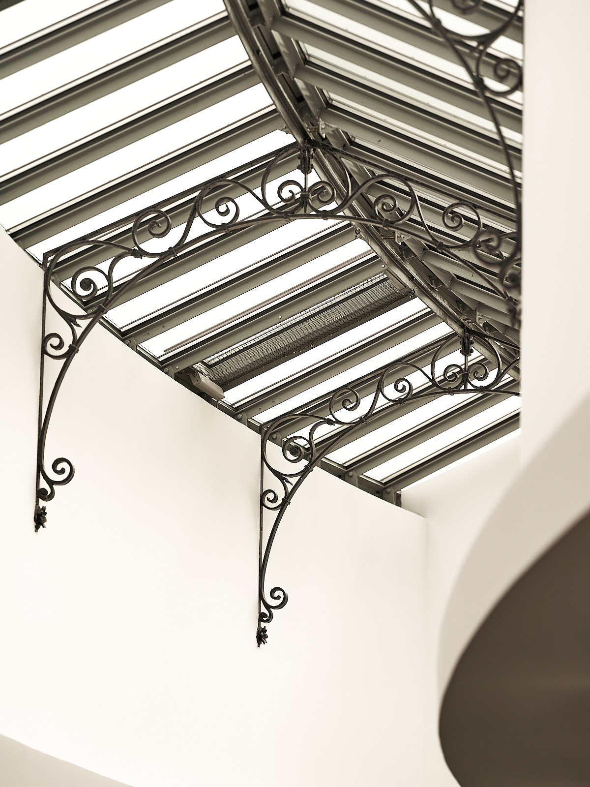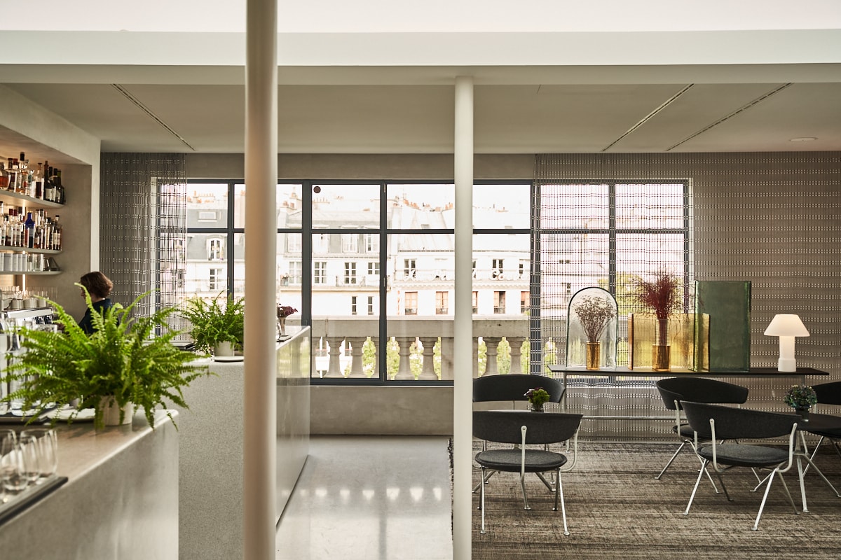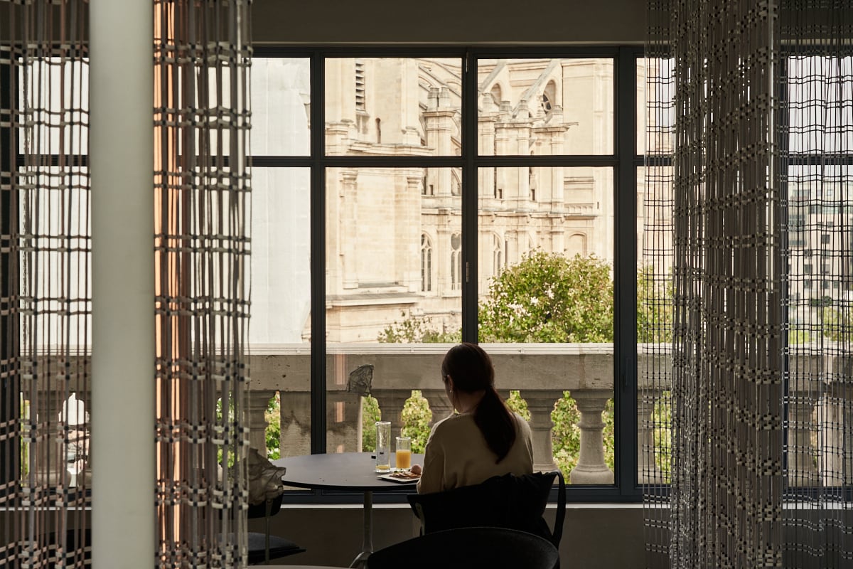 La salle principale du restaurant, traversante, offre un point de vue à couper le souffle. Sur la gauche, quelques ouvertures discrètes dans le mur permettent d’admirer l’enceinte majestueuse de la Bourse du Commerce et son impressionnante rotonde de béton dessinée par Tadao Ando. À droite, à travers une grande baie vitrée, le regard se perd sur l'église Saint-Eustache, sur la canopée du Forum des Halles et les cimes dodues du Centre Pompidou. D’où que l’on se place, la lumière du ciel est omniprésente.