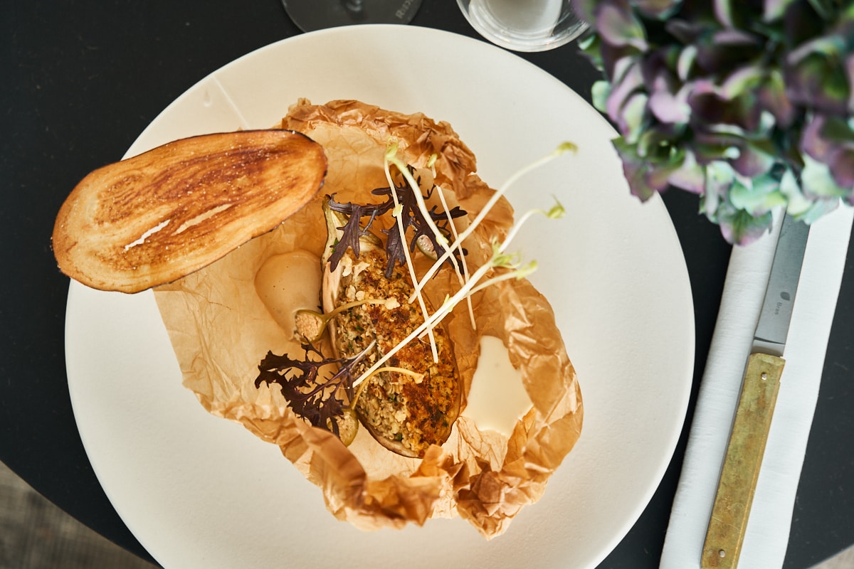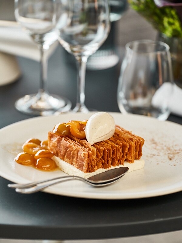 Ce jour d’automne, à la carte du menu dégustation qui se décline en 3, 5 ou 7 séquences, on retrouvait par exemple une demi-aubergine farcie d’un boulgour de blé, relevée d’ail noir, de câpres et de fromage blanc perlé à l’huile de sarriette. Mais aussi des ris d'agneau de l'Aveyron poêlés au beurre d’épeautre, accompagnés de cèpes de Haute-Loire et de carottes nouvelles, le tout recouvert d’un délicieux jus d’agneau perlé à l’olive et au citron. Et en dessert, un monumental millefeuille croustillant à l’épeautre sur un édredon de crème aux deux vanilles de Madagascar et Tahiti, était accompagné de soyeuses mirabelles rôties au miel.