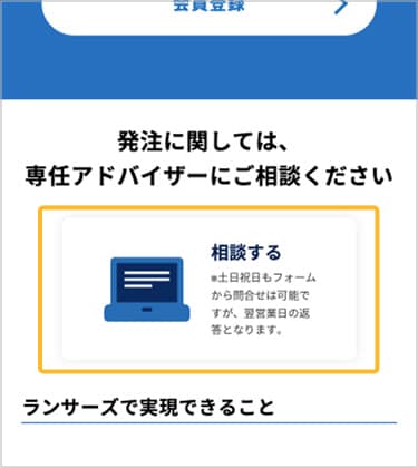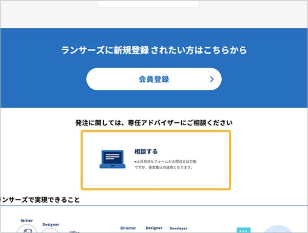 「Lancers」の特典専用ページにある「相談する」ボタンから、具体的な依頼内容を専任アドバイザーへご相談ください。専任アドバイザーへご相談後、特典をご利用いただけます。