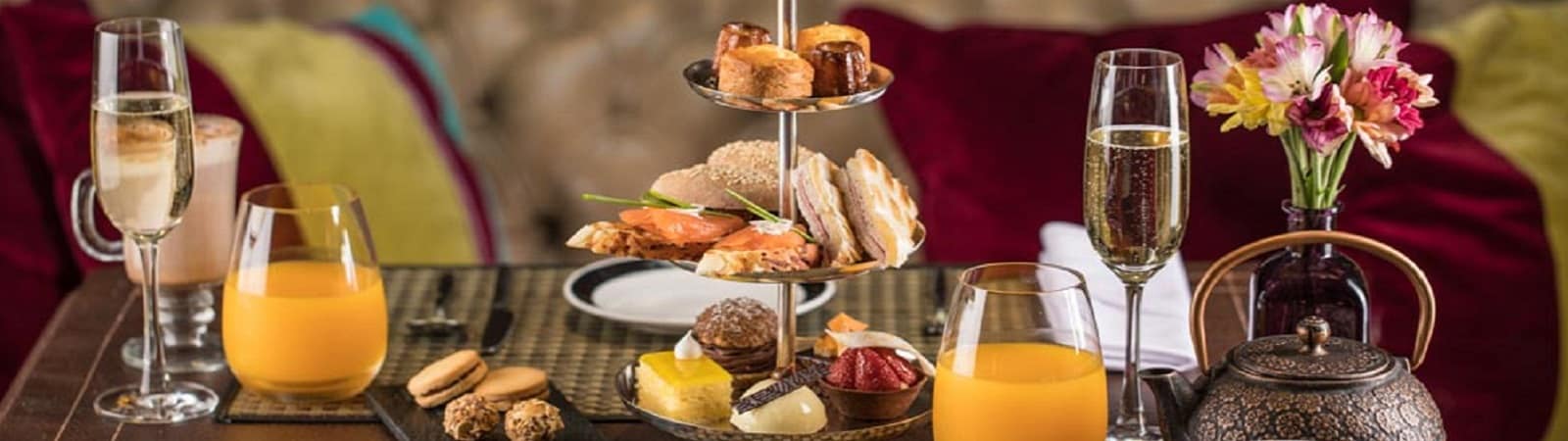 Disfrutá de la exquisita Patisserie elaborada por la chef pastelera, bocaditos salados, blends de té, jugos naturales y café. Incluye una copa de espumante.