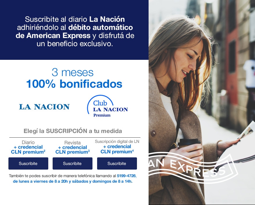 4) Beneficio valido desde el 1/06/2017 hasta el 31/12/2018 inclusive, para Socios titulares y adicionales de las Tarjetas personales American Express, emitidas y administradas por American Express Argentina S.A. (los “Socios” y las “Tarjetas”). Aplica sólo para nuevas suscripciones adheridas a través del Débito Automático con todas las tarjetas. Los 3 primeros débitos serán bonificados y a partir del cuarto débito, inclusive, se deberá abonar de forma mensual. La Nación, Zepita 3251, Ciudad de Buenos Aires. Cuit: 30-50008962-4. Para más información, conocer condiciones de suscripción, detalle de las promociones y precios, topes, y demás condiciones consulte en club.lanacion.com.ar o comunicándose al 5199-4726 de lunes a viernes de 8 a 20 horas, sábados y domingos de 8 a 14 horas.