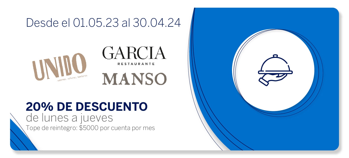 BENEFICIO VÁLIDO DESDE EL 01/01/2025 HASTA EL 30/06/2025, AMBOS INCLUSIVE, PARA LOS SOCIOS TITULARES Y ADICIONALES DE LAS TARJETAS PERSONALES Y CORPORATIVAS AMERICAN EXPRESS, EMITIDAS Y ADMINISTRADAS POR: (I) AMERICAN EXPRESS ARGENTINA S.A. (II) LOS BANCOS AUTORIZADOS (LOS “SOCIOS” Y LAS “TARJETAS”). LOS SOCIOS ACCEDERÁN A UN 20% DE DESCUENTO SIN TOPE Y EN EL ACTO EN ALMUERZOS Y/O CENAS DE LOS RESTAURANTES ADHERIDOS, ABONANDO LA TOTALIDAD DE LA COMPRA CON LAS TARJETAS. PROMOCIÓN NO COMBINABLE NI ACUMULABLE CON OTRAS PROMOCIONES VIGENTES. NO VÁLIDO PARA COMPRAS REALIZADAS A TRAVÉS DE PLATAFORMAS DE PAGO Y/O AGREGADORES. APLICABLE A LAS SIGUIENTES ENTIDADES EMISORAS DE TARJETAS AMERICAN EXPRESS: AMERICAN EXPRESS ARGENTINA S.A. Y BANCOS AUTORIZADOS, A SABER: BANCO MACRO S.A., BANCO SANTANDER ARGENTINA S.A., BANCO GALICIA Y BUENOS AIRES S.A., BANCO PATAGONIA S.A, REBA, LA APP DE TRANSATLÁNTICA COMPAÑÍA FINANCIERA S.A Y TARJETA NARANJA S.A.