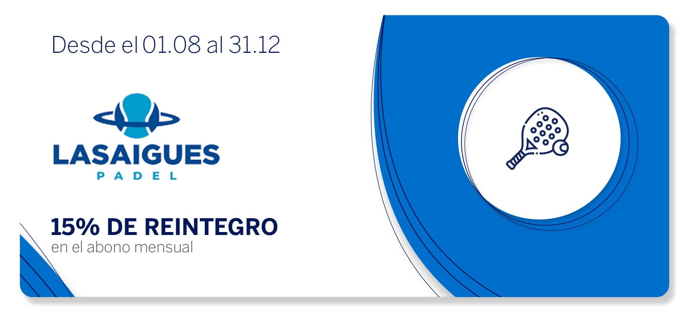 BENEFICIO VÁLIDO DESDE EL 01/04/2025 HASTA EL 30/06/2025 AMBOS INCLUSIVE 0 HASTA AGOTAR STOCK DE 300 (TRESCIENTOS) ABONOS MENSUALES -LO QUE SUCEDA PRIMERO-, PARA LOS SOCIOS TITULARES Y ADICIONALES DE LAS TARJETAS PERSONALES DE AMERICAN EXPRESS, Y TARJETAS PERSONALES EMITIDAS Y ADMINISTRADAS POR: (I) AMERICAN EXPRESS ARGENTINA S.A. Y (II) LOS BANCOS AUTORIZADOS (LOS “SOCIOS” Y LAS “TARJETAS”). LOS SOCIOS ACCEDERÁN A UN 15% DE REINTEGRO ABONANDO LA TOTALIDAD DEL “ABONO MENSUAL” DE LAS CANCHAS DE PADEL EN LASAIGUES LAS SIGUIENTES SEDES: EL ABIERTO, SHERATON, SANTA BARBARA y UNICENTER (CUIT 30714656747), CANNING (CUIT 30717578607), FERRO (CUIT 30716860058), PQUE LELOIR (CUIT 33716201339). AMERICAN EXPRESS REALIZARÁ EL REINTEGRO EN LA CUENTA DEL SOCIO TITULAR DENTRO DE LOS 90 (NOVENTA) DÍAS DE REALIZADA LA TRANSACCIÓN. EL PLAZO DEL REINTEGRO PODRÁ VARIAR DE ACUERDO CON LA ENTIDAD EMISORA. TOPE DE REINTEGRO $15.000 (QUINCE MIL PESOS) POR MES POR CUENTA. BENEFICIO NO VÁLIDO PARA COMPRAS REALIZADAS A TRAVÉS DE PLATAFORMAS DE PAGO Y/O AGREGADORES. BENEFICIO NO ACUMULABLE CON OTRAS PROMOCIONES NI LIQUIDACIONES. BENEFICIO APLICABLE A LAS SIGUIENTES ENTIDADES EMISORAS DE TARJETAS AMERICAN EXPRESS: AMERICAN EXPRESS ARGENTINA S.A. Y BANCOS AUTORIZADOS, A SABER: BANCO MACRO S.A., BANCO SANTANDER RIO S.A., BANCO GALICIA Y BUENOS AIRES S.A, BANCO PATAGONIA S.A Y REBA, LA APP DE TRANSATLÁNTICA COMPAÑÍA FINANCIERA S.A. PARA MÁS INFORMACIÓN Y CONDICIONES O LIMITACIONES APLICABLES, CONSULTE EN: https://lasaiguespadel.com.ar/. AMERICAN EXPRESS ARGENTINA S.A., ARENALES 707- CABA - CP: 1061, CUIT 30-57481687-0.