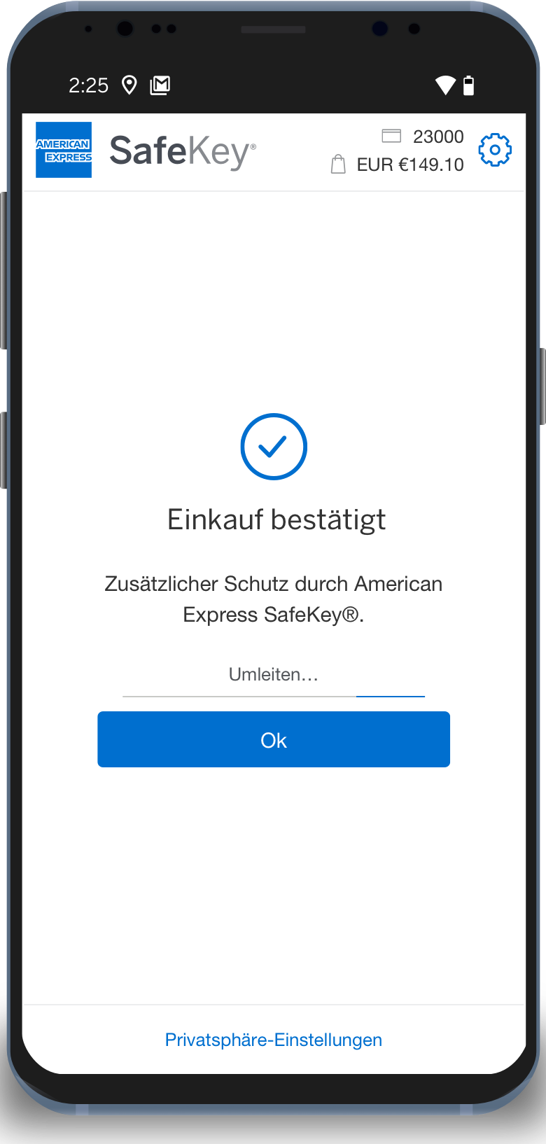 Ein neues EU-Gesetz, die Zweite Zahlungsdiensterichtlinie der EU (PSD2), verpflichtet alle Kartenaussteller, eine starke Kundenauthentifizierung (SCA) für Online-Zahlungen durchzuführen. SCA ist ein Zwei-Faktor-Authentifizierungsprozess, der dem elektronischen Bezahlvorgang ein weiteres Sicherheitslevel hinzufügt. Diese Richtlinie muss seit dem 25. August 2020 für alle relevanten Online-Zahlungen angewendet werden. Wenn Ihre Transaktion eine starke Authentifizierung erfordert und der Händler SafeKey nicht aktiviert hat, schreibt die Verordnung vor, dass wir die Transaktion ablehnen.