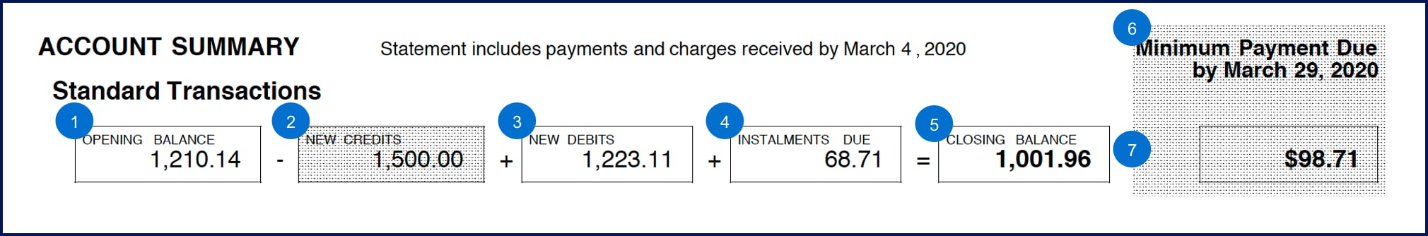 A summary of your credit card balance and transactions. Includes credits, debits and any instalments due.