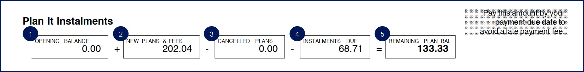A summary of any Plan It Instalment plans, including the original and remaining balance, plus any instalments due that month.
