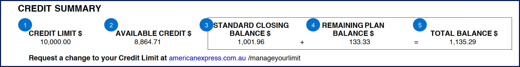 An overview of the credit position of your card, including how much you owe and how much more you can spend.