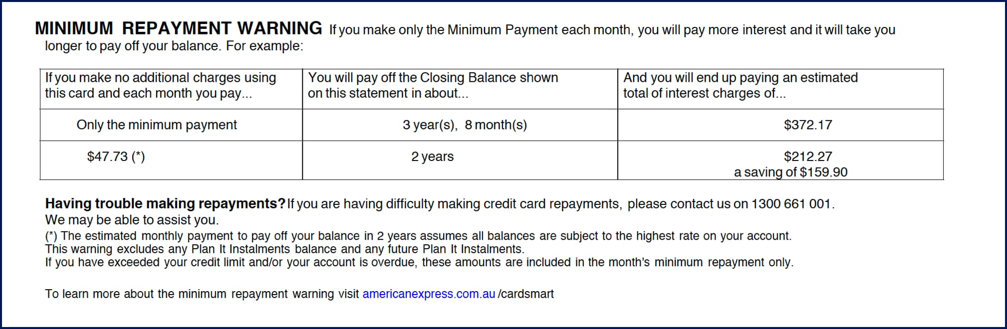 This shows you how long it would take to repay your balance and the interest you would be charged over that period, should you elect to pay the minimum payment each month. This warning also shows the amount you need to pay off each month to clear your balance in 2 years, the total interest you would pay, and how much you would save compared to only making minimum repayments. Please note the Minimum Payment Warning is only presented to Personal Card Members and not Business Card Members.