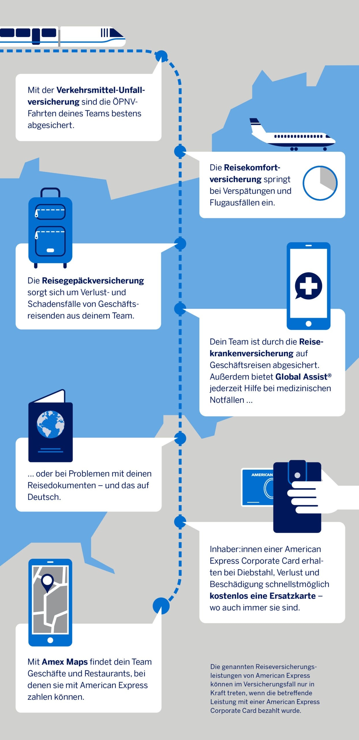 Arbeitssicherheit ist nicht nur am Arbeitsplatz oder dem Hin- und Rückweg ein wichtiges Thema, sondern auch, wenn Mitarbeitende auf Geschäftsreise gehen. Für Geschäftsreisen gibt es gesetzliche Vorschriften und damit steht das Unternehmen in der Verantwortung. Möchtest du diesen Verpflichtungen gerecht werden, ohne viele Einzelvereinbarungen abzuschließen? Dann entdecke die American Express Corporate Cards mit umfangreichem Versicherungsschutz: