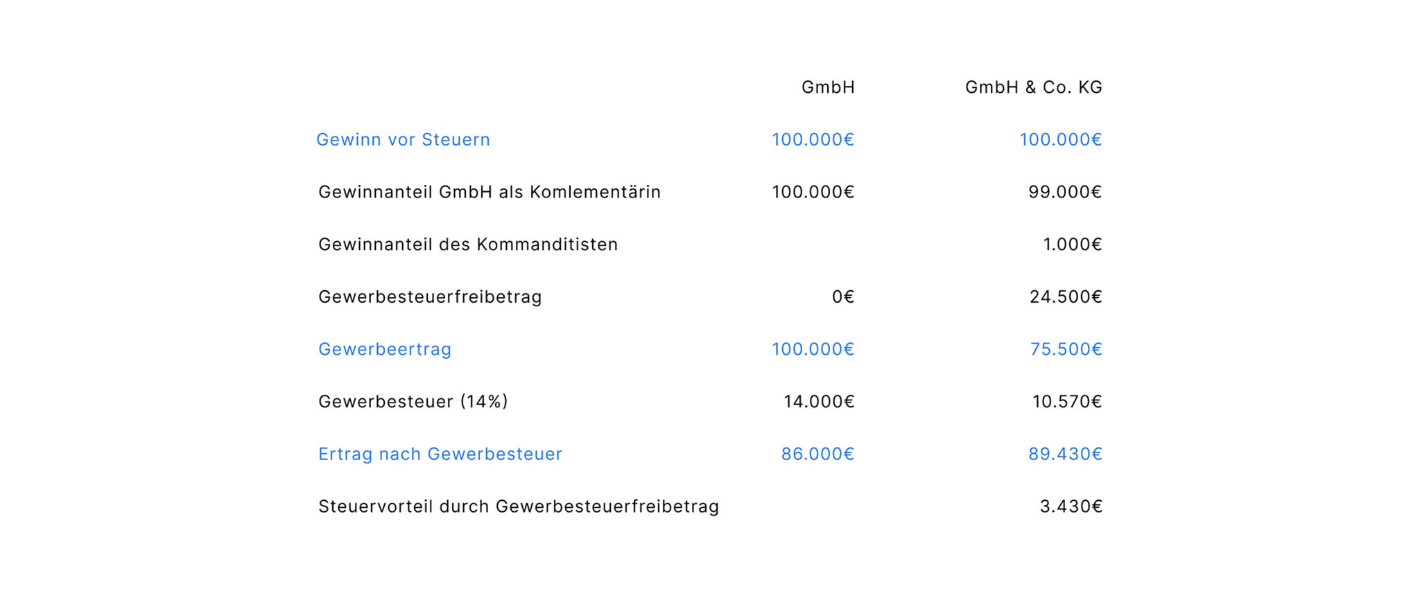 Durch das Konstrukt der GmbH & Co. KG als teilweise Personengesellschaft ergibt sich in diesem Fall ein gewisser Vorteil durch den Gewerbesteuerfreibetrag. Die folgende Gegenüberstellung veranschaulicht die unterschiedliche Besteuerung und ihre Auswirkungen: