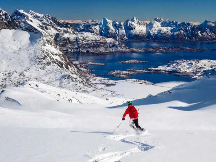 Fjordlandschaft an einem klaren Tag mit Personen auf einer beeindruckenden Felsklippe.